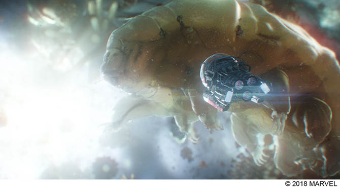 渡辺氏が『アントマン&ワスプ』で担当したのは、マイケル・ダグラス演じるハンク・ピム博士が、超小型ポッドに乗り込んで、28年前に“粒子の世界”で行方不明になった妻を捜索するシーンの一部。1~2秒ほどのショットだが、カビのような微生物や虹のように輝くプリズム、猛スピードで動く粒子が、ポッドに屈折・反射するという非常に複雑なエフェクトが施されている。