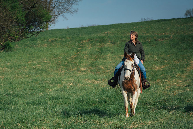 普段、牧場を見渡せる玄関のポーチで愛犬とくつろぐ時は、厚手のミリタリージャケットをはおり、デニムをウエスタン・ブーツにイン。