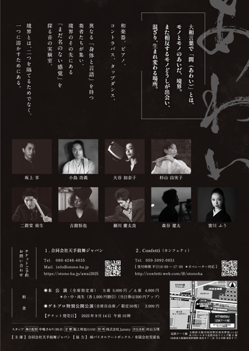 世界30ヵ国で1500公演を経験した和楽器奏者たちが、ピアノ、コントラバス、タップダンス、舞踊とともに、境界のその先にある「まだ名のない感覚」を探る音の実験室。