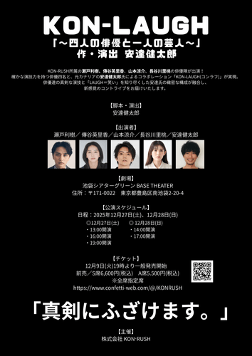 『KON-LAUGH~四人の俳優と一人の芸人~』が2025年12月27日(土)~12月28日(日)にBASE THEATER(〒171-0022 東京都豊島区南池袋2-20-4)にて上演されます。